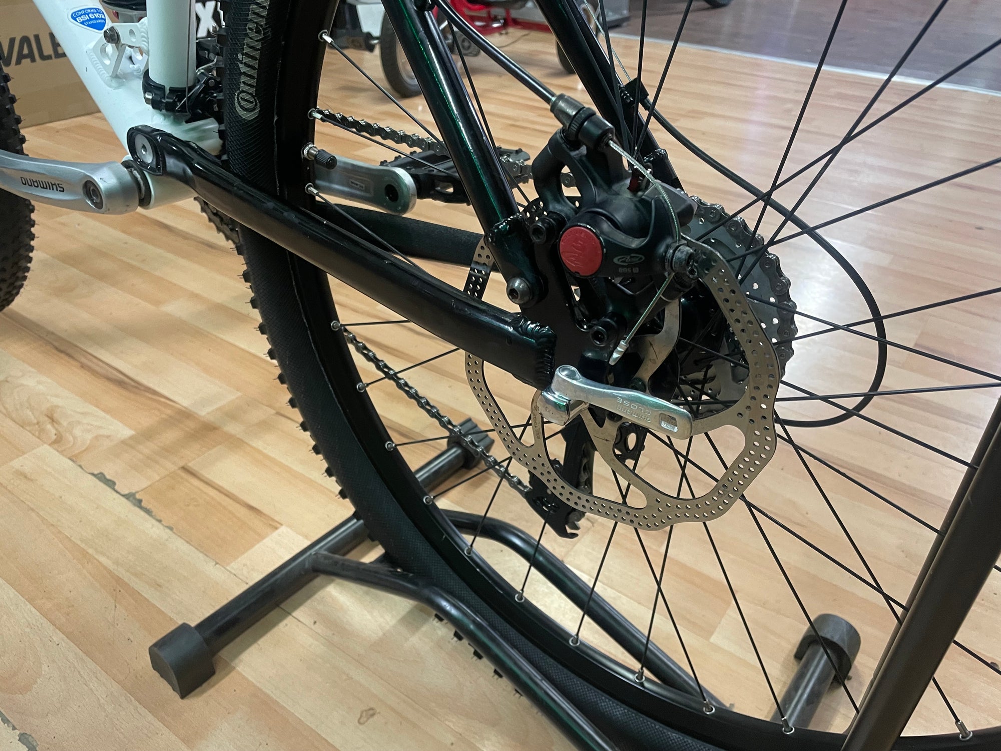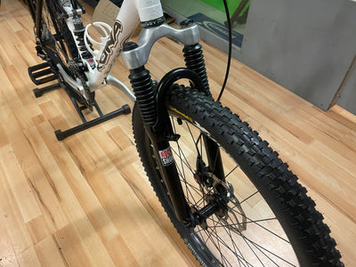 SPEC > Shimano Alivio 3x9 Speed with Shimano Deore Rapid fire shifter pods, Deore front mech, Shimano Crankset, Avid Speed dial Levers with Avid Mechanical Disc brakes and 180mm Rotors, Rockshox Suspension Forks, Fox Vanilla R coil rear shock, Lightweight 7005 Alloy Frame, D31 Eight Stem with Alloy Handlebar, QR seat post,26” Jalco Disc x320 QR wheel set with Continental X King Tyres fitted, DMR death grips, Platform pedals.